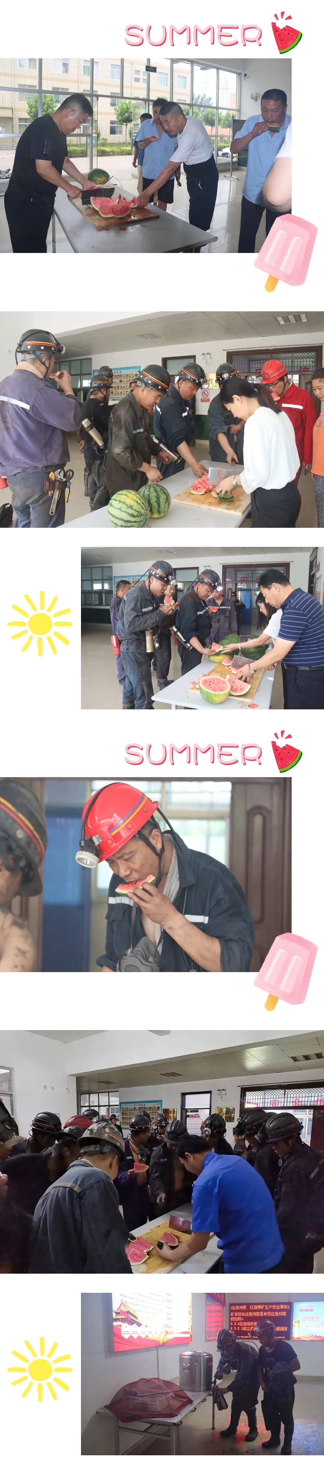 “夏送清凉”是红旗钢厂贯彻落实以职工为本,关心职工生活,促进安全生产的重要举措。红旗钢厂党总支书记、矿长李杰,要求一二线生产工区、职工食堂、总务科等各单位积极行动起来,要以维护职工身心健康为己任,尽力为职工提供安全、卫生、舒适的工作和生活ayx爱游戏官方app平台入口,改善防暑降温条件,保障夏季用餐食品安全,保护好职工高温生产的安全健康。本次活动在副井口处24小时为一线职工准备消暑绿豆茶饮品、利用交接班时间为上下井工人准备清凉西瓜,此次活动将根据天气情况持续至暑期结束。