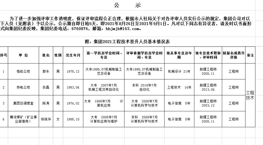 为了进一步加强评审工作透明度,保证评审流程公正合理,根据市人社局关于对各评审人员实行公示的规定,集团公司对以下人员(见附表)予以公示,公示期自即日始5天,即2021年8月26日至2021年9月1日。凡对以下同志有异议者,请及时以书面形式向集团纪委反映,集团纪委电话:6760876,邮箱:hhjwjb@163.com。