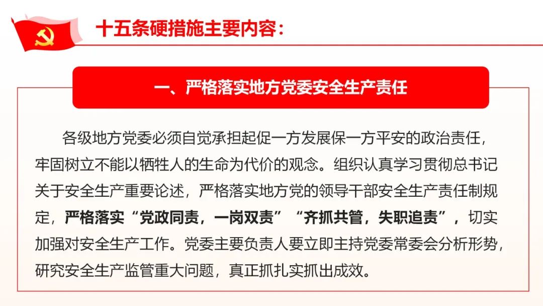(一)地方党委安全生产责任落实情况。地方各级党委是否自觉承担起"促一方发展、保一方平安"的政治责任,是否按照《地方党政领导干部安全生产责任制规定》严格落实"党政同责、一岗双责、齐抓共管、失职追责"要求。党委主要负责人是否主持党委常委会会议分析安全生产形势、研究安全生产重大问题,切实加强安全生产工作的组织领导等。