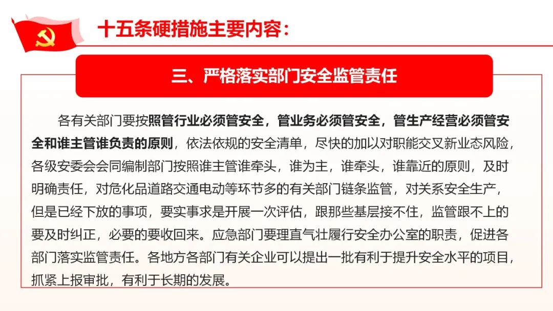 (三)部门安全监管责任落实情况。各有关部门是否按照"管行业必须管安全、管业务必须管安全、管生产经营必须管安全"和"谁主管、谁负责"的原则依法依规提出并落实安全责任清单,是否按照"谁主管谁牵头、谁为主谁牵头、谁靠近谁牵头"的原则及时明确职能交叉以及新业态风险的安全监管责任。是否推动危化品、燃气、道路运输、电动自行车等有关部门抓实全链条安全监管,是否对关系安全生产但是已经下放的事项开展评估等。