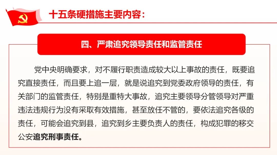 (四)领导责任和监管责任追究情况。各地区是否追究较大以上生产安全事故中不履行职责的党委政府领导责任、有关部门监管责任,发生重特大生产安全事故的是否追究主要领导责任,对严重违法违规行为没有采取有效措施甚至放任不管、构成犯罪的是否移交司法机关追究刑事责任等。