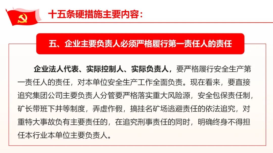(五)企业主要负责人履行第一责任人责任的情况。企业法定代表人、实际控制人、实际负责人是否严格履行安全生产第一责任人的法定责任,是否严格落实重大危险源安全包保责任制、矿长带班下井等制度,是否搞"挂名矿长"等弄虚作假手段逃避责任,对重特大事故负有责任的是否落实行业禁入相关规定等。
