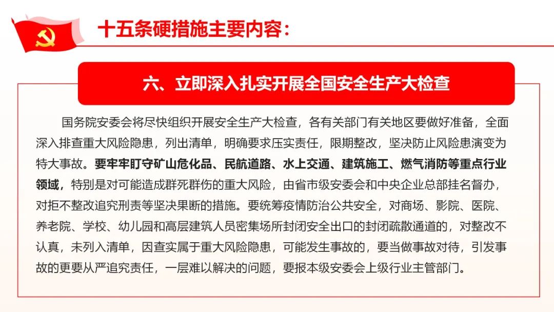 要紧紧围绕贯彻落实习近平总书记关于安全生产重要指示精神和党中央、国务院决策部署。推动贯彻执行国务院安委会关于加强安全生产工作的十五条硬措施。重点检查以下内容∶