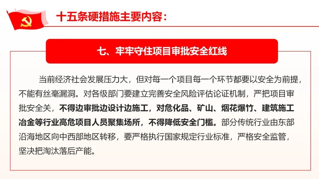 (七)项目审批安全红线把守情况。各有关部门是否建立完善安全风险评估论证机制。是否存在"边审批、边设计、边施工"情况,是否擅自降低危化品、矿山、烟花爆竹、建筑施工、冶金等行业高危项目、人员聚集场所安全门槛,是否对东部沿海地区向中西部地区转移的部分传统行业严格安全监管等。