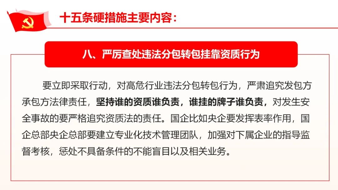 (八)违法分包转包、挂靠资质行为查处情况。各有关部门是否严厉查处高危行业违法分包转包行为。是否严肃追究发包方、承包方法律责任,是否严格追究生产安全事故中资质方责任,央企国企总部是否建立专业化技术管理团队加强对下属企业的指导、监督、考核、惩处等。