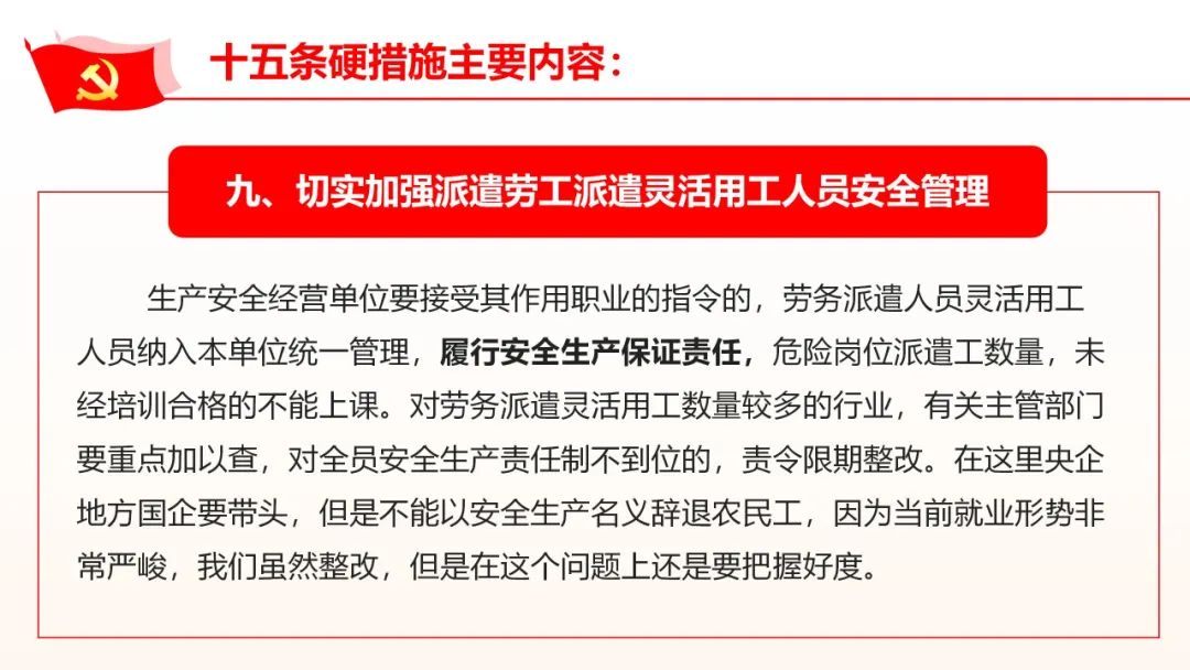 (九)劳务派遣和灵活用工人员安全管理情况。生产经营单位是否将接受其作业指令的劳务派遣人员、灵活用工人员纳入本单位统一管理,危险岗位是否严控劳务派遣员工数量,有关部门是否对相关情况较突出的行业领域部署开展重点执法检查。央企国企在有关人员管理上是否发挥示范带头作用等。