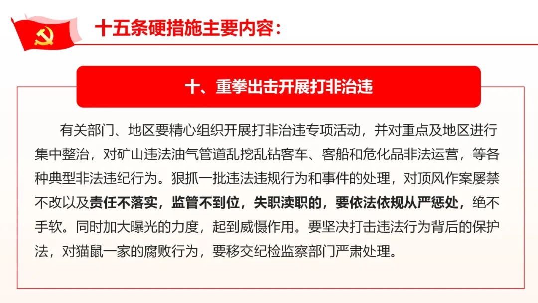 (十)"打非治违"工作开展情况。各地区、各有关部门是否组织开展"打非治违"专项活动,是否采取精准措施严厉打击矿山违法盗采、油气管道乱挖乱钻、客车客船渔船和危化品非法运营等各种典型非法违法行为。是否依法依规从重惩处顶风作案、屡禁不改以及监管不到位等问题,是否加大曝光警示力度,是否坚决打击违法行为背后的"保护伞"、加大"猫鼠一家"腐败行为查处力度等。