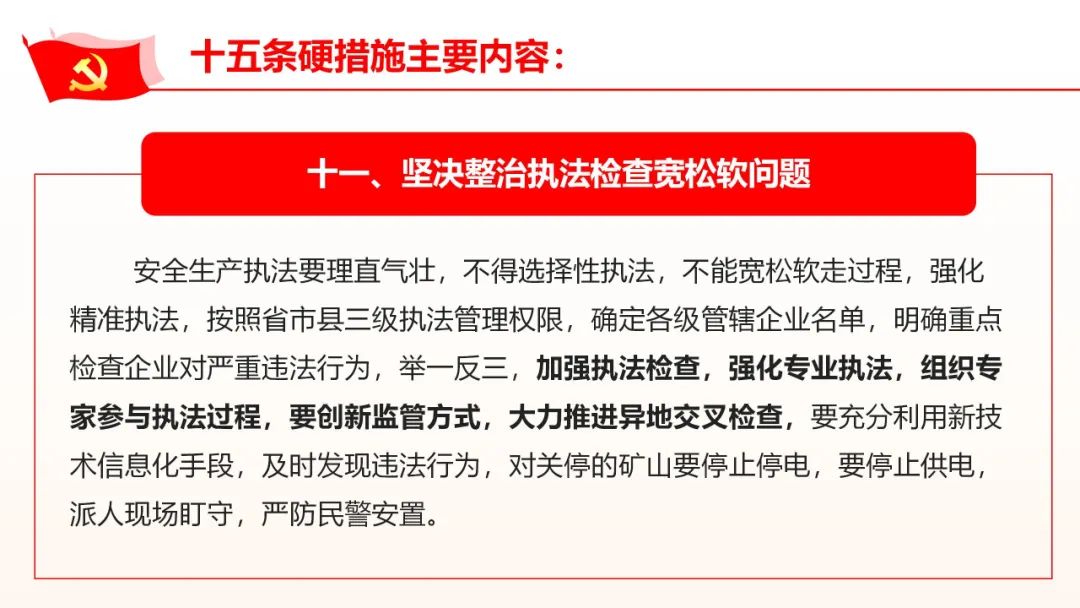 (十一)执法检查宽松软整治情况。安全生产监管执法是否存在选择性执法以及宽松软、走过场等问题。是否确定省市县三级执法管辖企业名单并明确重点检查企业。是否针对事故暴露问题举一反三加强执法检查,是否组织专家参与执法过程、推进异地交叉检查,是否利用新技术、信息化手段及时发现违法行为,对关停的矿山是否采取停止供电、派人现场盯守等。