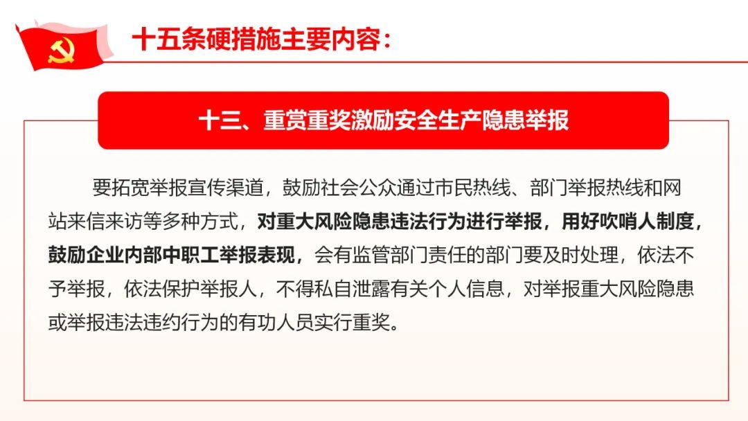 (十三)安全生产隐患举报奖励情况。是否拓宽举报奖励宣传渠道,是否建立完善安全生产"吹哨人"制度。负有安全生产监督管理职责的部门是否及时处理举报,是否依法保护举报人并落实举报奖励制度等。