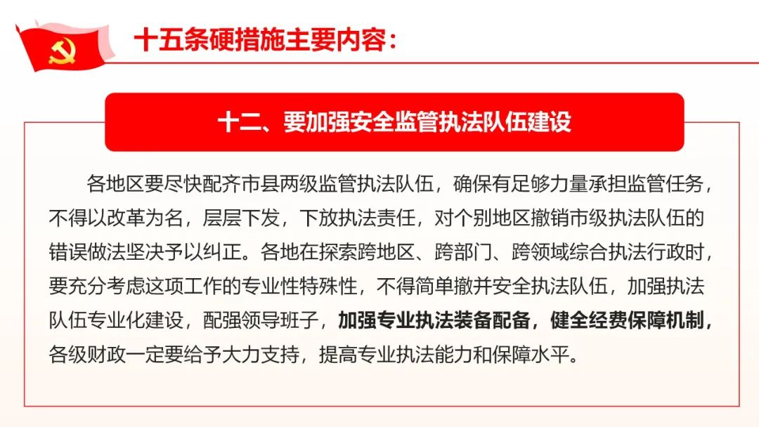 (十二)安全监管执法队伍建筑情况。市县两级监管执法队伍监管力量是否能够承担监管任务,是否存在层层下放执法责任等行为,是否简单撤并安全执法队伍,是否开展执法队伍专业化建筑、加强专业执法装备配备,是否建立健全安全生产监管执法经费保障机制、加强各级财政支持等。