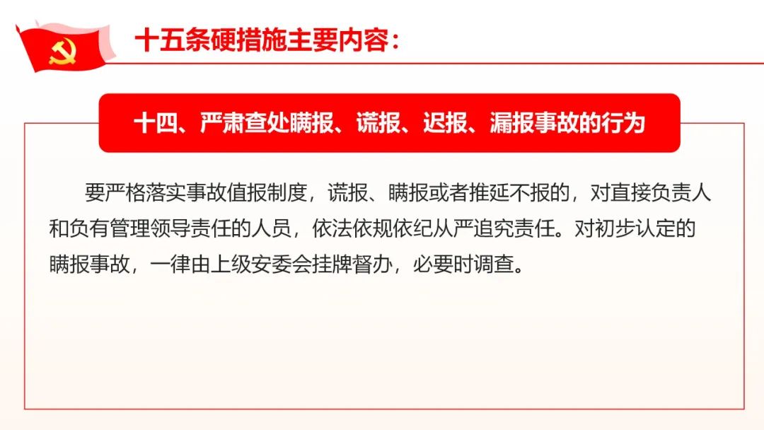 (十四)事故瞒报谎报迟报漏报行为查处情况。各有关部门是否严格落实事故直报制度,是否对生产安全事故隐瞒不报、谎报或者拖延不报的直接责任人、负有管理和领导责任的人员从严追究责任,是否由上级安委会挂牌督办初步认定的瞒报事故并在必要时提级调查等。