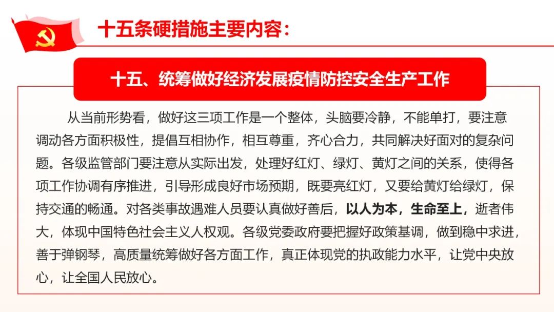 (十五)统筹做好经济发展、疫情防控和安全生产工作情况。地方各级党委政府、各有关部门是否根据当前形势统筹做好经济发展、疫情防控和安全生产工作,是否处理好安全监管和指导服务的关系,是否及时对特困行业纾困解难保障安全管理。是否发挥一线人员做好安全生产工作的主动性。是否做好各类事故遇难人员的善后处置工作等。